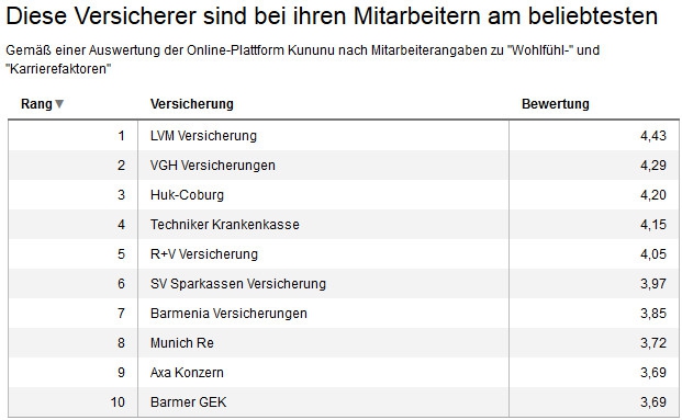 Auf Platz 2 des Rankings landete die VGH, an der den Mitarbeitern vor allem das Sozialbewusstsein und der Umgang mit älteren Kollegen gefällt. Platz 3 ging an die Huk-Coburg, die vor allem mit guten Arbeitsbedingungen und Gleichberechtigung bei ihren Mitarbeitern punktet.