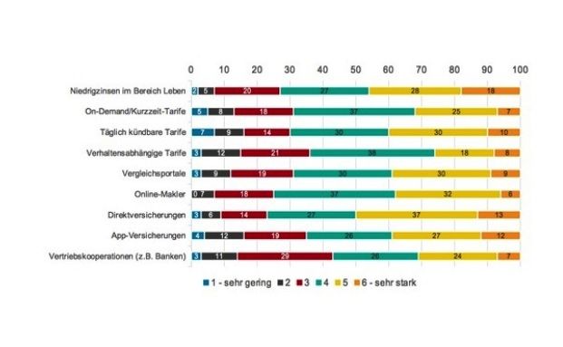 Desweiteren befürchten sieben von zehn Anbietern, dass sie durch Tarife Kunden verlieren, die sie von einen Tag auf den anderen buchen und wieder kündigen können. 69 Prozent der Befragten geben an, diese On-Demand oder Kurzzeittarife seien gefährlich für den eigenen Umsatz. 65 Prozent gehen zudem davon aus, dass sich über Apps gekaufte Versicherungen als problematisch erweisen könnten.
