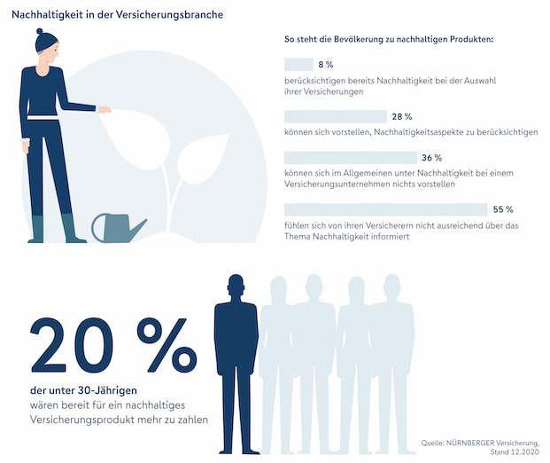 Nachhaltige Versicherungsprodukte tun sich im Vertrieb nach wie vor schwer. So seien bislang nur 12 Prozent der Deutschen dazu bereit, trotz bestehenden Interesses an nachhaltigen Produkten, auch mehr dafür zu zahlen. Eine Mehrheit wünscht sich außerdem mehr Aufklärung zum Thema, wie eine aktuelle Umfrage im Auftrag der Nürnberger Versicherung zeigt.