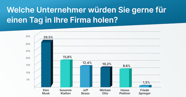 Die Ergebnisse variieren allerdings je nach Branche. So liegt Elon Musk mit 37 Prozent in Beratungsunternehmen, mit 32 Prozent bei Dienstleistung/Lifestyle/Beauty und mit 25 Prozent im Gastro-Gewerbe gleichauf mit Susanne Klatten. In zwei Branchen muss er sich aber geschlagen geben: Im Bereich Bau und Handwerk führt Susanne Klatten mit 24,5 Prozent die Liste vor ihm an (18,9 Prozent), und im Bereich Handel setzen sich Jeff Bezos (25 Prozent) und Michael Otto (19,4 Prozent) an die Spitze derer, die deutsche Kleinunternehmer am liebsten einen Tag lang als Praktikant begrüßen würden.