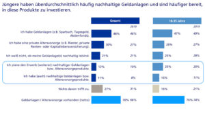 Während im Durchschnitt 11 Prozent angeben, dass sie bereits nachhaltige Geldanlagen beziehungsweise Altersvorsorgeprodukte besitzen, geben das 16 Prozent der 18- bis 35-Jährigen an. Im Bundesdurchschnitt planen 12 Prozent der Deutschen, entsprechende Produkte zu erwerben. Bei den Jüngeren sind es mit 25 Prozent doppelt so viele.