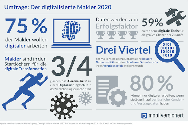 Das sind einige Ergebnisse der Online-Umfrage „Der digitalisierte Makler“, die die Brokertech-Plattform Mobilversichert zum zweiten Mal in Folge in Kooperation mit der Fachzeitschrift „AssCompact“ durchgeführt hat. Den Angaben zufolge nahmen daran 396 Makler vom 20. bis 24. April teil.
