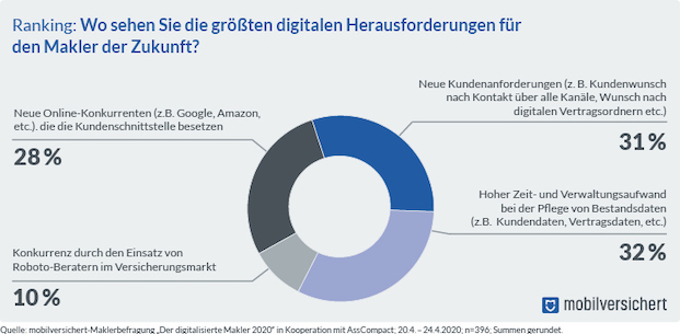 Wie schon im Vorjahr wurden Vermittler nach den größten digitalen Herausforderungen und Chancen der Zukunft befragt. „Bei den größten digitalen Herausforderungen zeigen sich leichte Verschiebungen im Vergleich zu 2019“, stellten die Autoren fest.