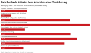 Für mehr als jeden dritten Deutschen sind zudem positive Tests und eine gute Reputation des Anbieters (37 Prozent) sowie ein umfangreiches Dienstleistungsangebot im Schadenfall (34 Prozent) wichtig. Ein digitales Schaden- und Leistungsmanagement und die Erreichbarkeit über mehrere Kanäle wie ein Online-Kundenportal oder eine Schaden-App spielen indes eine eher untergeordnete Rolle (14 beziehungsweise 13 Prozent).