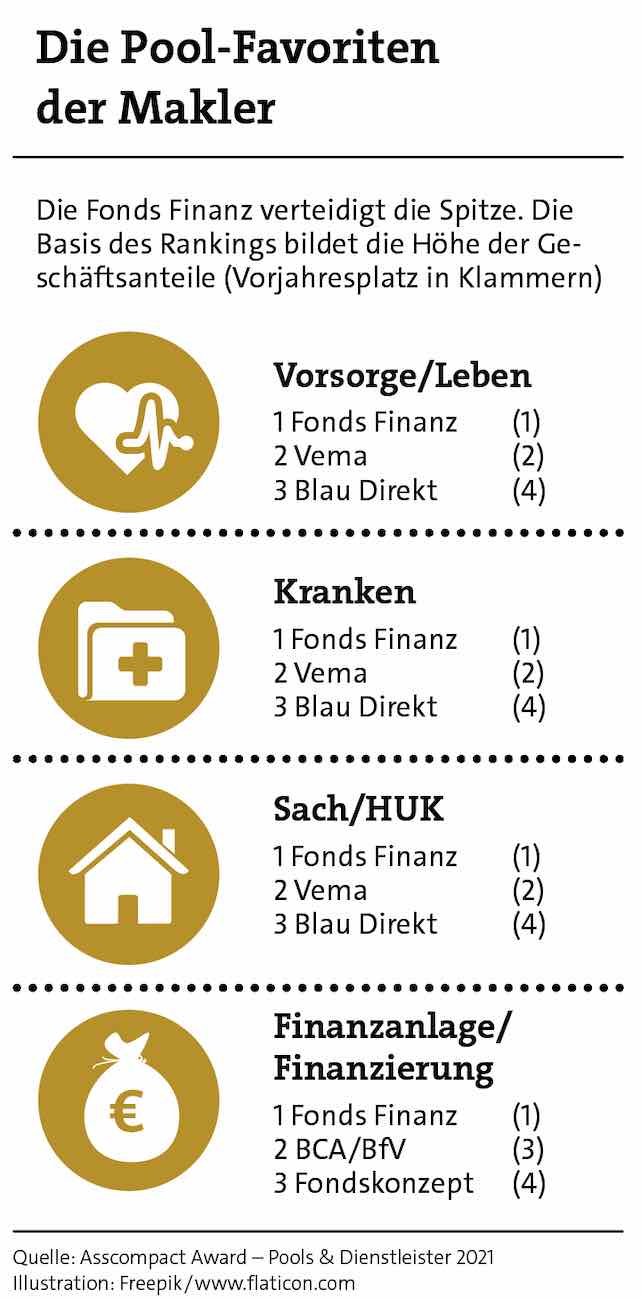 Unter den „großen Pools“ dominiert nach wie vor ein Unternehmen aus München – die Fonds Finanz. Laut aktueller Pool-Studie von „Asscompact“ vereint die Fonds Finanz mit Abstand das meiste Geschäft, das Makler und Mehrfachagenten an Pools und Dienstleister in den vergangenen zwölf Monaten vermittelt haben. Nach eigenen Angaben konnte die Fonds Finanz im Jahr 2019 Umsatzerlöse in Höhe von 178,3 Millionen Euro einfahren und damit den Rekordwert von 2018 überbieten. Für 2020 liegen noch keine Zahlen aus München vor. Laut der Maklerpool-Studie „Pool Radar 2020“, die im vergangenen Dezember zum neunten Mal von den Autoren Sabine Brunotte und Michael Franke veröffentlicht wurde, vereinigte die Fonds Finanz damit gut rund 17 Prozent des Gesamtumsatzes der 29 teilnehmenden Pools und Verbünde.