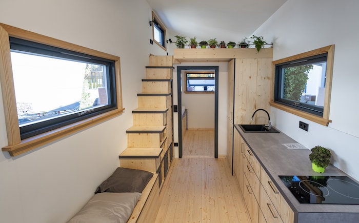 Innenraum eines ausgestellten Tiny-Hauses anlässlich des Info- und Aktiontages Nachhaltigkeit im bayerischen Erding.
