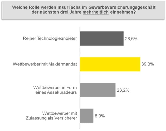 Gut 71 Prozent der Versicherer sehen Insurtechs im Bereich der Gewerbeversicherung als Wettbewerber an. Bis Ende 2021 werden die Start-ups mit den Etablierten entweder um das Maklermandat kämpfen (rund 40 Prozent), in Form eines Assekuradeurs (23 Prozent) als Konkurrent auftreten oder gar als eigenständiger Versicherer (rund 9 Prozent), erwarten die Vorstände und Führungskräfte der Versicherungsindustrie. 80 davon befragte die Unternehmensberatung EY Innovalue im Rahmen eines Versicherungsroundtables Ende 2019.