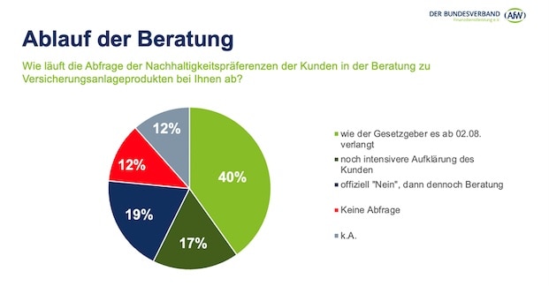 Im damaligen Abfragezeitraum erklärten jedenfalls 40 Prozent der befragten Vermittler in Sachen Abfragepflicht genauso vorzugehen, wie es der Gesetzgeber von ihnen verlangt. 17 Prozent klärten ihre Kunden auch noch darüber hinaus auf. 19 Prozent meinten, die Beratung zu ESG-Themen auch dann anzugehen, obwohl ihre Kunden dies zunächst nicht wünschten. Jeder achte (12 Prozent) Befragte bekannte, keine Abfrage zu tätigen, weitere 12 Prozent beantworteten die Frage nicht.