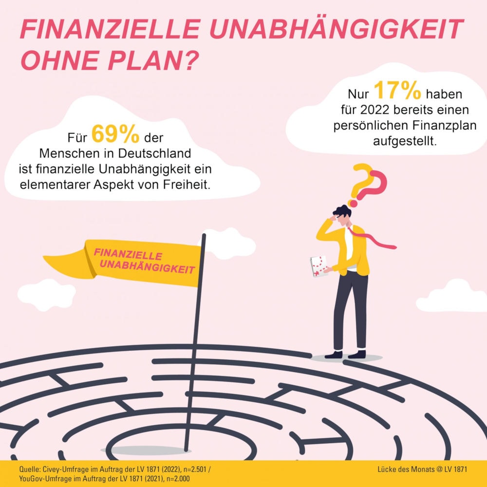 Das klingt schon ein bisschen nach: Wasch mich, aber mach mich nicht nass! Denn zwar betrachten es 69 Prozent der Menschen in Deutschland als wichtigen Aspekt von Freiheit, finanziell unabhängig zu sein. Zumindest gaben sie das im Rahmen des „LV 1871 Financial Freedom Report 2021“ noch an. Gleichwohl haben nur 17 Prozent im neuen Jahr einen Plan aufgestellt, wie es mit ihnen finanziell weitergehen soll. Das geht aus einer Umfrage unter 2.500 Menschen hervor, die der Dienstleister Civey im Auftrag der Lebensversicherung von 1871 (LV 1871) durchführte.