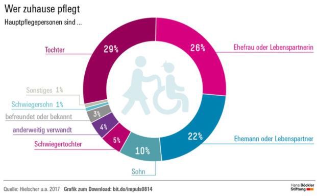 Gut 70 Prozent der Pflegebedürftigen werden demnach zuhause versorgt. Dabei verzichtet mehr als die Hälfte der befragten Haushalte vollkommen auf Unterstützung durch Pflegedienste oder andere professionelle Hilfe. In jedem fünften Pflegehaushalt macht die Hauptpflegeperson alles allein.