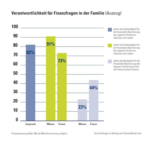 Geht es um die finanzielle Absicherung der Familie, sehen sich vor allem Männer in der Verantwortung. In einer Forsa-Umfrage im Auftrag von Cosmos Direkt gaben 91 Prozent der Männer an, selbst für Finanzfragen und die finanzielle Absicherung der Familie zuständig zu sein.