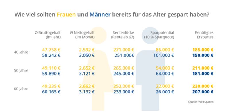 Wie viel Geld Frauen und Männer fürs Alter gespart haben sollten (Quelle: Weltsparen)