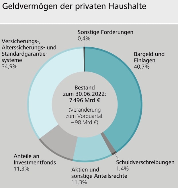 Demnach sank das Geldvermögen der privaten Haushalte im zweiten Quartal um 98 Milliarden Euro im Vergleich zum ersten Quartal. Zu Ende Juni 2022 lag es nunmehr bei 7.496 Milliarden Euro. Zum Geldvermögen zählen Bargeld, Wertpapiere, Bankeinlagen sowie Ansprüchen gegenüber Versicherungen (siehe Grafik).