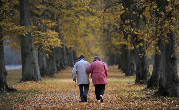 Ein älteres Paar geht im Park von Schloss Wilhemsthal in Calden (Landkreis Kassel) spazieren: Inwiefern sich Riester-Renten für Sparer lohnen, hat Finanztest nun untersucht.
