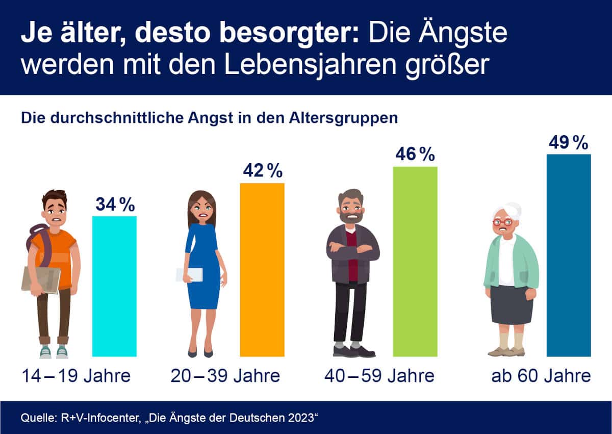 Eine Studie des Versicherers R+V lässt darauf schließen, dass Menschen in Deutschland ängstlicher sind, je älter sie sind. „Wir beobachten, dass es bei den Sorgen der Menschen je nach Lebensalter große Unterschiede gibt. Mit dem Alter steigt die Angst“, sagt Grischa Brower-Rabinowitsch, Leiter der Studie „Die Ängste der Deutschen“. Einzige Ausnahme ist übrigens die Furcht vor dem Klimawandel. Die ist nämlich bei jungen Menschen besonders ausgeprägt.