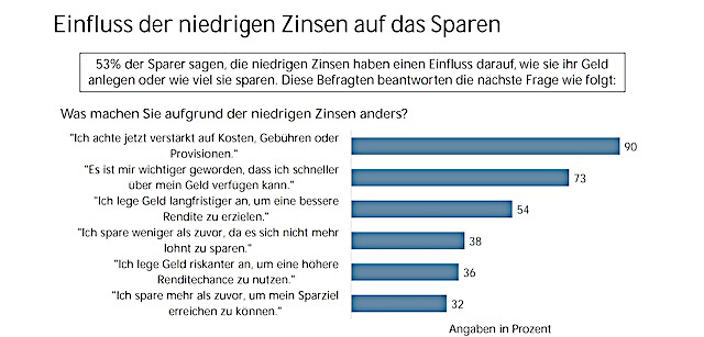 Das anhaltende Niedrigzinsumfeld beeinflusst das Anlageverhalten der deutschen Verbraucher. Das sagt etwa die Hälfte von 1.000 Sparern, welche die Aufsichtsbehörde Bafin in einer Online-Umfrage zum Thema Niedrigzinsen befragte. Gerade die Kosten fallen für diese Befragte jetzt stärker ins Gewicht. So wären 42 Prozent der Bankkunden zum Beispiel bereit, den Anbieter zu wechseln, wenn ihre Bank Negativzinsen einführt.