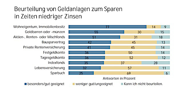 77 Prozent der Befragten halten im Niedrigzinsumfeld vor allem auch Wohneigentum für eine geeignete Form der Geldanlage. 55 Prozent setzen auch auf Goldbarren oder -münzen. Fast zwei Drittel der Verbraucher sind der Meinung, Gold sei eine sichere und krisenfeste Anlageform.