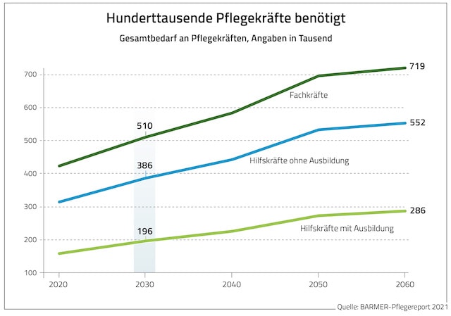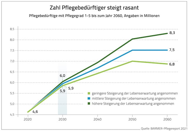 Bis 2030 werden nach neuesten Hochrechnungen der Barmer 6 Millionen Menschen pflegebedürftig sein – also rund eine Million mehr als bisher angenommen. Und das wird Konsequenzen haben, warnt die Krankenkasse in ihrem Pflegereport 2021: Mehr als 180.000 Pflegekräfte werden bis dahin fehlen, zeigt die Berechnung weiter.