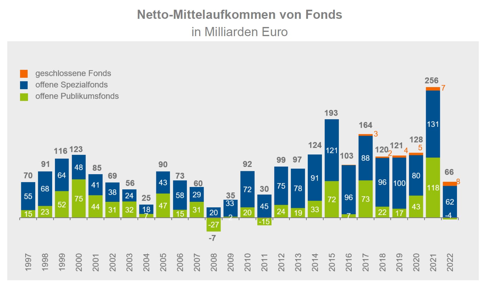 Bringen wir – für die Presse nicht ganz üblich – zunächst die gute Nachricht: Die Investmentbranche hat in Deutschland auch in einem Krisenjahr wie 2022 massig Geld eingesammelt. 65,5 Milliarden Euro waren es, wie der Branchenverband BVI meldet. Das ist zwar viel weniger als noch im Hurra-Jahr 2021 mit satten 256,1 Milliarden Euro. Doch es ist auch kein Netto-Abfluss wie noch in der Finanzkrise 2008 und immerhin mehr als in der Eurokrise 2011 (siehe folgende Grafik).