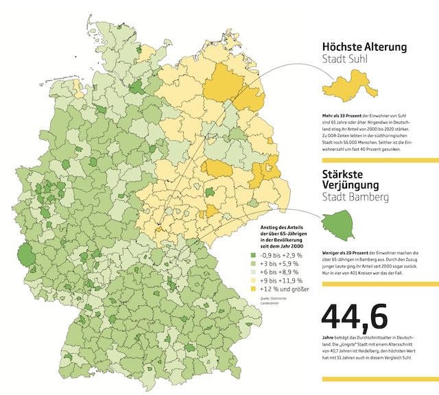 Besonders deutlich wird das Ost-West-Gefälle, wenn man sich die Entfernung zu der sich am schnellsten verjüngenden Stadt Deutschlands anschaut: Bamberg in Bayern. Ein kurzer Abbieger von Suhl aus auf die A73, und nach rund einer Stunde ist man angekommen. In Bamberg schrumpfte der Anteil der Bürger im Rentenalter innerhalb der vergangenen 20 Jahre von 20,6 auf 19,7 Prozent. „Die Achse Bamberg — Erlangen ist eine Boomregion“, kommentiert der örtliche Bundestagsabgeordnete Thomas Silberhorn aus der CSU die GDV-Zahlen. „Junge Leute bleiben oft nach ihrem Studium hängen.“