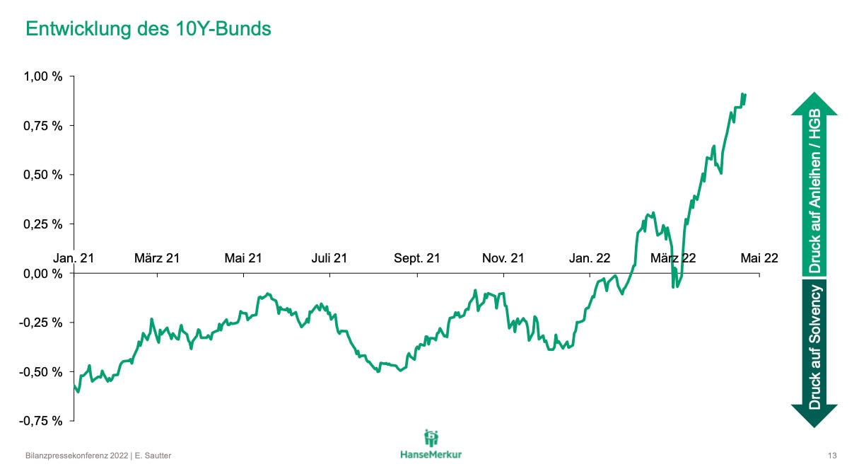 Der aktuelle Trend am Anleihemarkt lässt Versicherer offenbar nicht kalt. „Den Zinsanstieg hat keiner so schnell erwartet“, räumt Eberhard Sautter, Chef des Versicherers Hanse-Merkur, am Dienstag auf der Bilanzpressekonferenz in Hamburg ein – und er blendet eine Grafik ein, um zu zeigen, was er meint. Sie zeigt die Rendite der zehnjährigen Bundesanleihe. Bis Februar lag sie noch unter Wasser, um dann wie aus dem Stand auf fast ein Prozent emporzuschnellen.