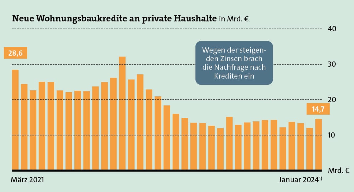 Der steigende Zins verteuerte zudem die Kredite, und beides zusammen ließ in logischer Konsequenz die Nachfrage nach geliehenem Geld einbrechen. Ein Beispiel dafür ist die im Baufi-Geschäft sehr aktive Bank ING. Sie reichte im Niedrigzinsjahr 2021 noch 17,6 Milliarden Euro an Krediten neu aus oder sagte sie zumindest zu. 2022 waren es nur noch 13,1 Milliarden Euro – ein Viertel weniger. Die Bundesbank erfasste branchenweit ähnlich desaströse Zahlen, wie die folgende Grafik zeigt.