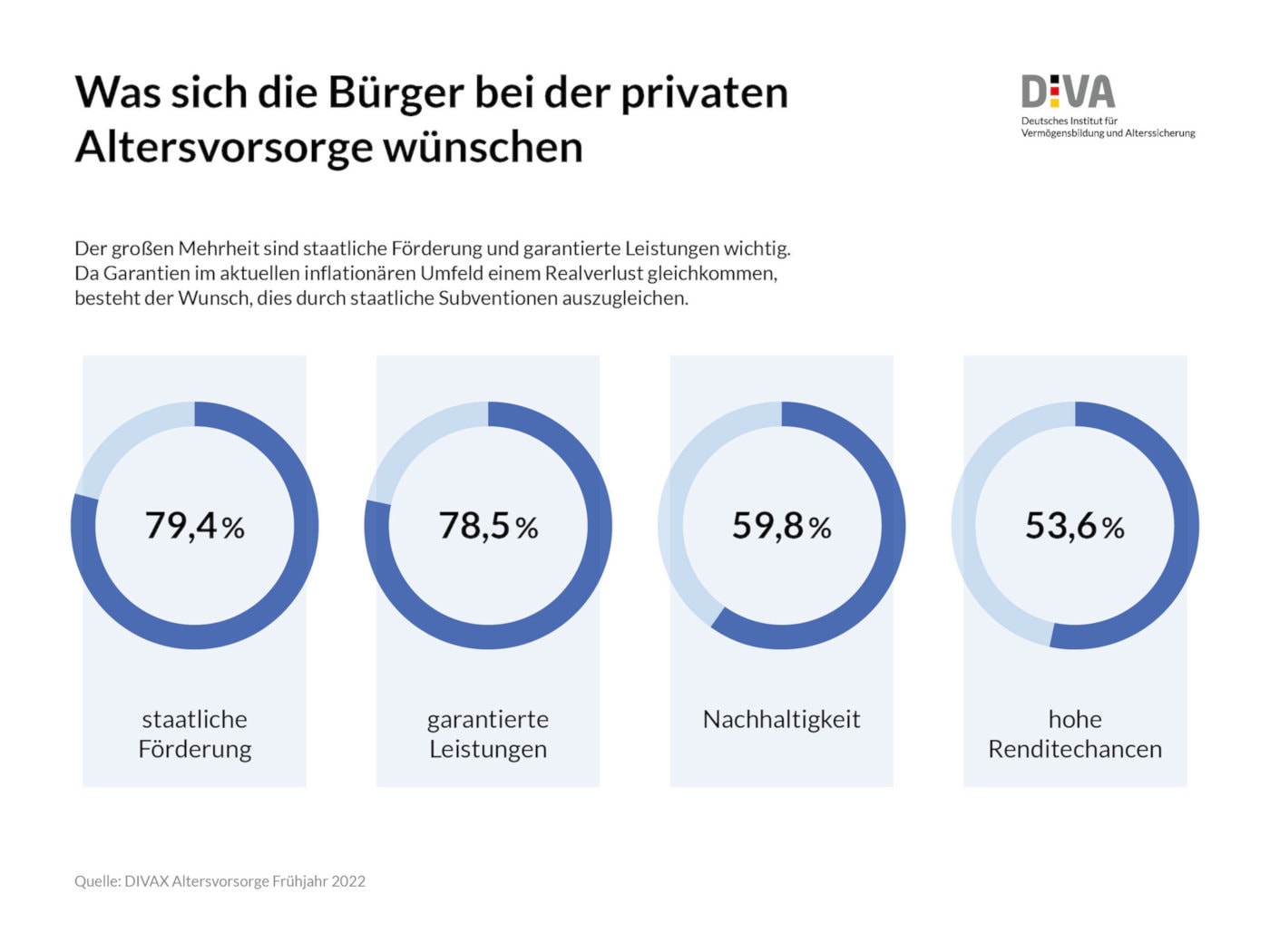 Fragt man danach, was bei der privaten Vorsorge sehr wichtig oder wichtig ist, nennen jeweils knapp 80 Prozent: garantierte Leistungen und staatliche Förderung. Und welcher Zuschuss darf es sein? Stellt man die Befragten vor die Wahl zwischen Steuervorteilen und direkten Zulagen wie zum Beispiel in der Riester-Rente, ist über die Hälfte für Zulagen, rund 20 Prozent mögen lieber Steuervorteile.