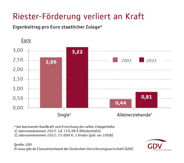 Demnach müsse ein alleinstehender Mann, der den Mindestlohn verdient, im nächsten Jahr 3,22 Euro einzahlen, um einen Euro vom Staat dazuzubekommen. 2002 musste er hingegen nur 2,66 Euro aus eigener Tasche in den Vertrag einzahlen, um umgerechnet einen Euro Förderung zu erhalten (siehe erste Grafik). Noch stärker sei der Effekt bei einer alleinstehenden Mutter mit einem Jahreseinkommen von 25.000 Euro und zwei Kindern (geboren vor 2008): Während sie 2002 lediglich 44 Cent für einen Förder-Euro selbst aufbringen musste, wären es im kommenden Jahr mit 81 Cent fast doppelt so viel. „Je nach Einkommens- und Familiensituation sind sogar noch höhere Einbußen möglich“, heißt es seitens des GDV.