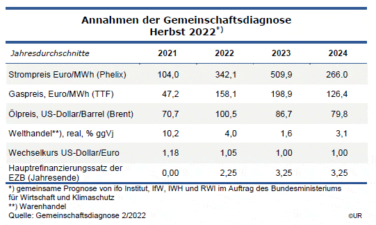 Die führenden Wirtschaftsforschungsinstitute haben soeben ihre kurz- und mittelfristigen Prognosen vorgestellt. Für das Jahr 2023 erwarten sie nun für das reale BIP im Vorjahresvergleich einen Rückgang um 0,4 Prozent. Im Frühjahr hatten sie noch eine positive Zuwachsrate von 3,1 Prozent erwartet. Das ist die größte mir bekannte Revision der Vorhersagen (minus 3,5 Prozentpunkte) innerhalb von nur sechs Monaten. Die wichtigsten Annahmen der neuen Prognose betreffen die Energiepreise: Die Gaspreise steigen zwischen 2021 und 2023 um 320 Prozent, die Strompreise um 390 Prozent.