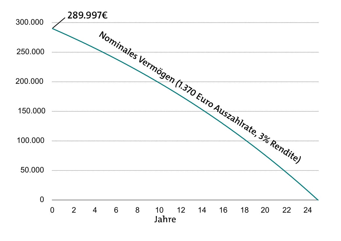 Auf diese Weise haben Erika oder Max Mustermann ein Guthaben von knapp 290.000 Euro erreicht. Ohne Inflation. Wenn wir das für die kommenden 25 Jahre mit einem konstanten Nominalbetrag verrenten, ergäbe das 1.370 Euro im Monat. Das Restguthaben würde sich dann wie folgt entwickeln: