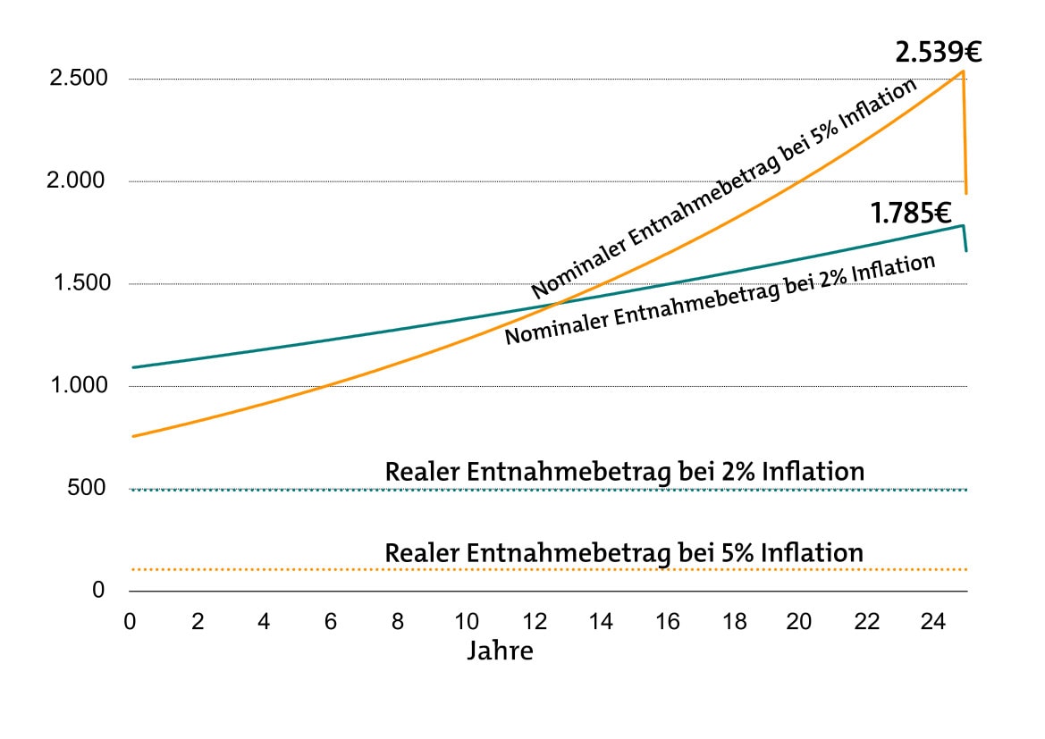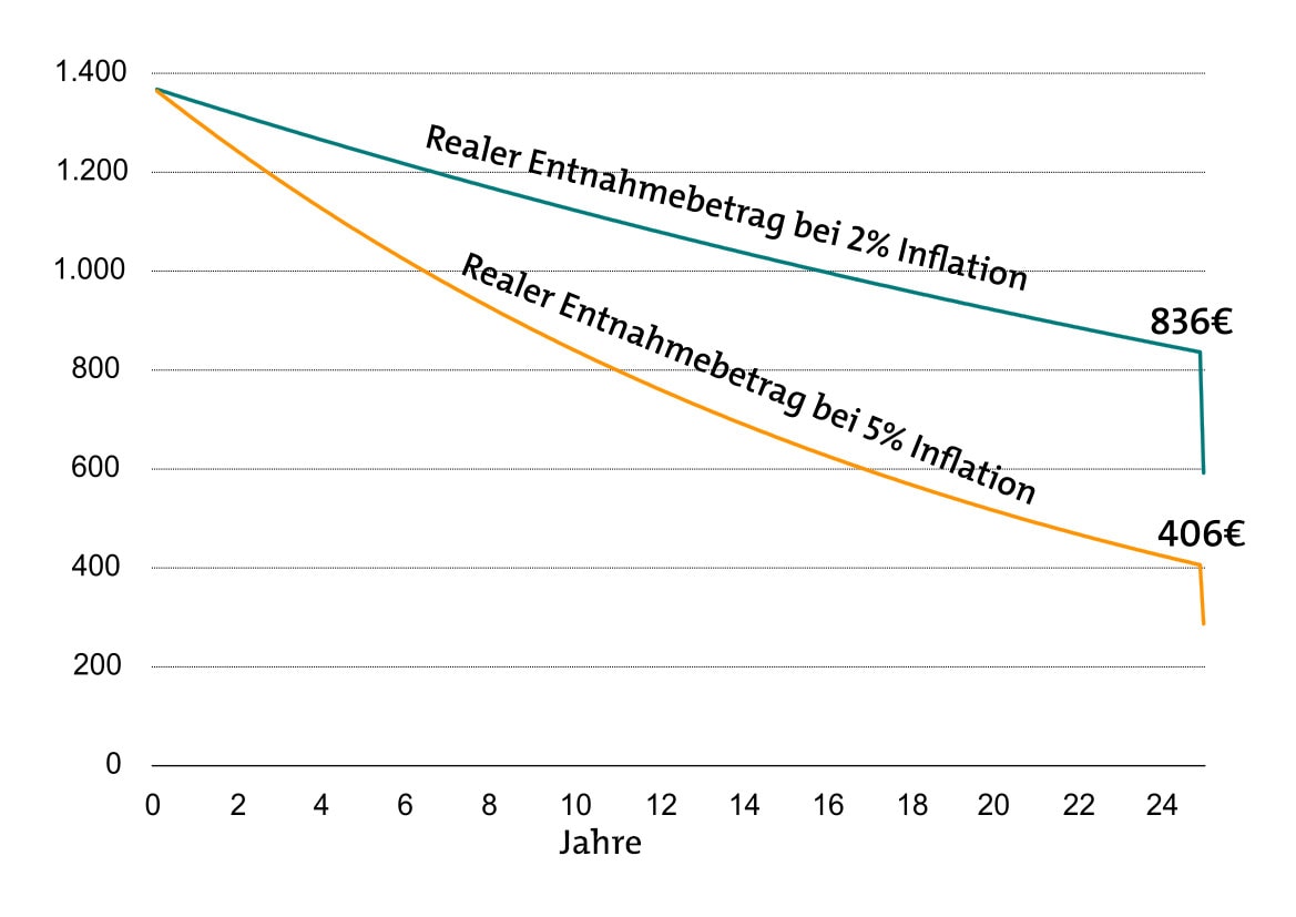 Verrenten wir die beiden Beträge über 25 Jahre mit gleichbleibender realer Kaufkraft, ergibt sich folgende Grafik: