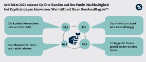 Und als dritten Effekt kommen wir schließlich zum Megatrend Nachhaltigkeit. Seit März 2021 müssen Vermittler ihre Kunden in Beratungen auf den Punkt Nachhaltigkeit hinweisen. Wie sind die Erfahrungen unserer Leser mit dieser gesetzlichen Verpflichtung? Gut 35 Prozent bemerken bei ihren Kunden ein verstärktes Interesse am Thema Nachhaltigkeit. Weitere knapp 44 Prozent meinen, dies sei stark vom Alter abhängig. Üblicherweise sind es eher die jüngeren Generationen, denen dieses Thema besonders wichtig ist, Stichwort: „Fridays for Future“-Bewegung. Rund 40 Prozent unserer Leser tragen das Thema Nachhaltigkeit gezielt an den Kunden heran, für ein gutes Viertel spielt es aber im Beratungsalltag noch gar keine Rolle.