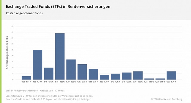 Exchange Traded Funds (kurz: ETFs) werden zunehmend auch in Fondspolicen genutzt. Ein Vorteil sind die niedrigen Kosten, wie auch eine Auswertung des Software-Hauses Franke und Bornberg zeigt. So wird die überwiegende Zahl der börsengehandelten Indexfonds der Versicherer zu laufenden Kosten zwischen 0,05 Prozent und 0,35 Prozent pro Jahr angeboten. Weniger als 10 der 147 analysierten ETFs in Rentenversicherungen fallen mit jährlich 0,65 bis 0,70 Prozent in die teuerste Kategorie.