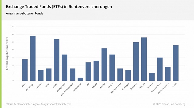Die Analyse von 20 Versicherern zeigt zudem, dass viele Gesellschaften mittlerweile bis zu knapp 30 ETFs in Rentenversicherungen anbieten. Das größte Angebot in diesem Bereich haben laut Auswertung die Alte Leipziger, Condor und Swiss Life.