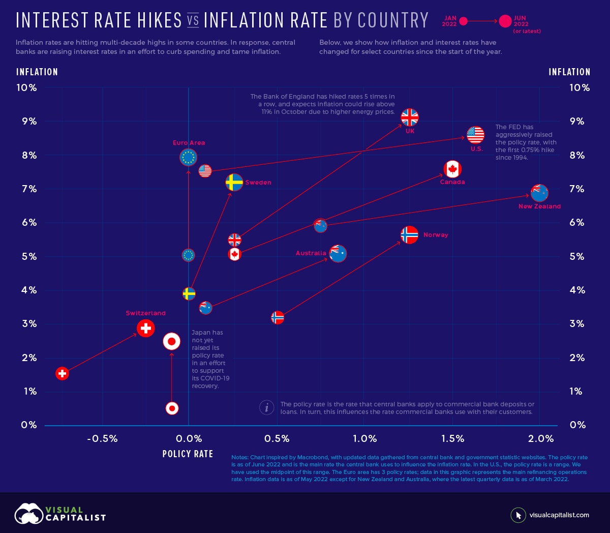Ein neues Werk von Visualcapitalist.com geht der globalen Inflationswelle nach und dem, wie die Zentralbanken darauf reagieren. Es zeigt ein Diagramm, das aus Inflationsrate (senkrecht) und Leitzins (waagerecht) ausgewählter Regionen besteht. Je weiter rechts ein Punkt steht, desto höher liegt der Leitzins. Und je höher ein Punkt steht, desto höher liegt die Inflation.