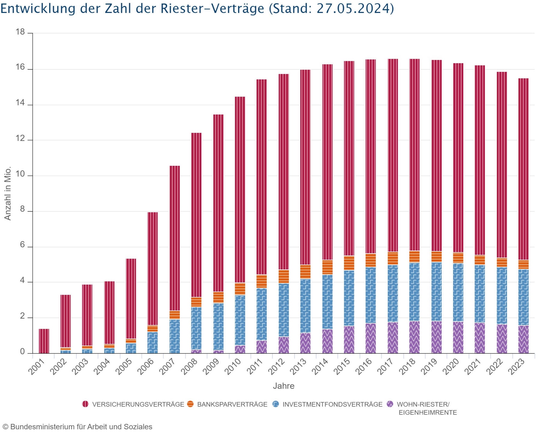 Ende 2023 existierten laut Statistik des Bundesministeriums für Arbeit und Soziales (BMAS) 15,511 Millionen Riester-Verträge. Das sind rund 362.000 weniger als ein Jahr zuvor. Stornierte Verträge sind aus den Zahlen herausgerechnet, enthalten sind aber ruhende Verträge, in die zurzeit niemand einzahlt. Das BMAS schätzt ihren Anteil auf 20 bis 25 Prozent.