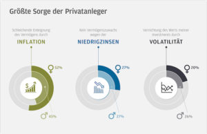 Besonders „bemerkenswert“ finden die Studienautoren in diesem Sinne vor allem das Umfrageergebnis bei der Frage nach dem „Auf und Ab der Börse“ – auch Volatilität genannt: Denn während mit 26 Prozent rund jeder vierte Mann besorgt ist, dass die Schwankungen an den Kapitalmärkten den Wert der Investments vernichten, sind es bei den sonst eher vorsichtigen Frauen nur 20 Prozent.