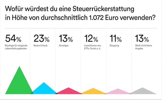 54 Prozent der Deutschen planen Steuerrückerstattungen als Rücklagen für steigende Lebenshaltungskosten. In Sparprodukte, wie etwa Fonds, zu investieren, kommt dagegen nur 12 Prozent in der Sinn, wie eine aktuelle Yougov-Umfrage im Auftrag der Finanzplattform Taxfix ergab.