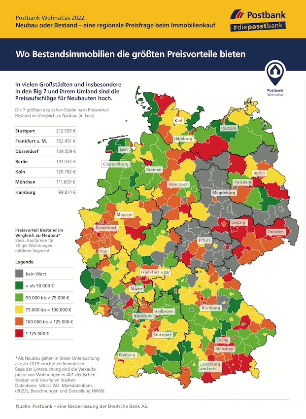 Das Hamburgische WeltWirtschaftsInstitut (HWWI) hat die Immobilienangebote in den 401 Landkreisen und kreisfreien Städten Deutschlands untersucht und gibt im Postbank Wohnatlas 2022 einen Überblick über die regionalen Preisabstufungen zwischen Eigentumswohnungen im Bestand und Neubauobjekten, die zwischen 2019 und 2021 fertiggestellt wurden.