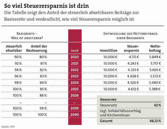 Wer 2020 demnach 10.000 Euro in eine Basisrente investiert, kann davon 9.000 Euro steuerlich absetzen. Beim aktuellen Spitzensteuersatz von 46,12 Prozent (inklusive Solidaritätszuschlag und Kirchensteuer in Höhe von 8 Prozent) erhält man 4.151 Euro als Steuerersparnis zurück. Dieser Betrag erhöht sich jährlich bis auf etwa 4.600 Euro im Jahr 2025. Die Steuerersparnis steigt mit den folgenden Jahren noch weiter, entsprechend reduziert sich der Nettobeitrag (siehe Tabelle).