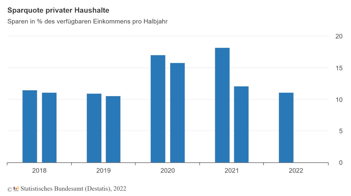 Die Menschen sparen kaum noch, weil die Preise so stark steigen? Das trifft sicherlich auf viele Haushalte zu. Doch rein durchschnittlich berichtet das Statistische Bundesamt etwas anderes. Demnach lag die sogenannte Sparquote der privaten Haushalte im ersten Halbjahr 2022 bei 11,1 Prozent des verfügbaren Einkommens. Aufs durchschnittliche Einkommen heruntergebrochen macht das 240 Euro pro Person.