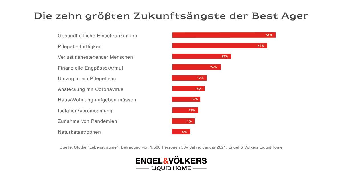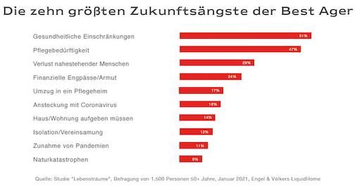Gefragt nach weiteren Zukunftsängsten, antworteten die sogenannten Best Ager vor allem mit der Sorge bezüglich einer schweren Krankheit (51 Prozent, siehe Grafik). Vor Pflegebedürftigkeit haben 47 Prozent der Befragten Angst. Auch einen nahestehenden Menschen zu verlieren, trübt die Vorfreude von fast jedem Dritten auf den Lebensabend. Alle drei Sorgen nehmen – im Gegensatz zum Thema Altersarmut – mit zunehmendem Alter zu: So machen sich zwar 57 Prozent der über 70-Jährigen Gedanken um gesundheitliche Einschränkungen, aber nur 45 Prozent der 50- bis 54-Jährigen.