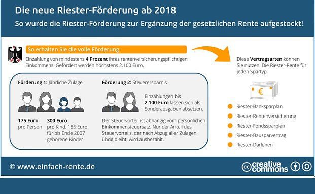 Zum Jahreswechsel wird sich bei der Riester-Rente einiges ändern. Wann Sparer ab 2018 Riester-Förderung erhalten und wie viel es gibt, zeigt die Infografik von einfach-rente.de.