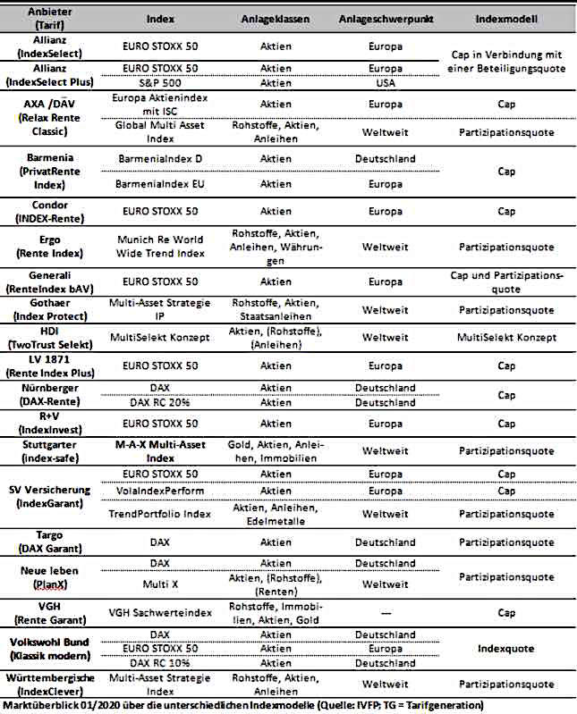 19 Produkte stehen dabei aktuell zur Wahl. Der neueste Zugang ist PlanX der Neuen Leben – dieses Produkt kam 2019 auf den Markt. Einen Überblick über die angebotenen Indexpolicen und Details der jeweiligen Ausgestaltung zeigt die folgende Grafik.