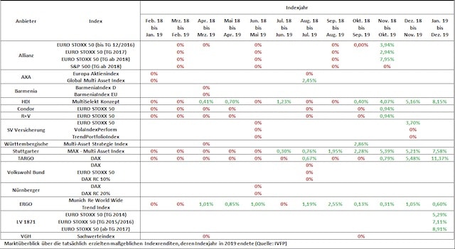 Erst Indexjahre, die im vierten Quartal 2019 endeten, profitierten von dem sehr guten Börsenjahr 2019. „Indexjahre, die im vierten Quartal 2019 endeten, erwirtschafteten mehrheitlich maßgebliche Indexrenditen von zum Teil weit über 5 Prozent. In der Spitze wurden sogar mehr als 10 Prozent erreicht“, schreiben die Analysten des IVFP.