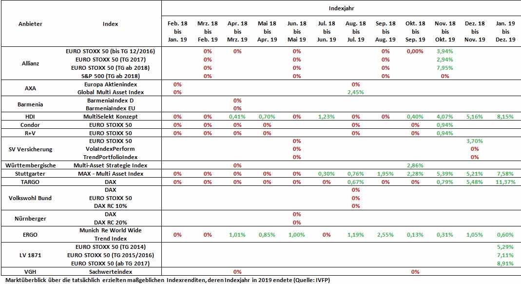Erst Indexjahre, die im vierten Quartal 2019 endeten, profitierten von dem sehr guten Börsenjahr 2019. „Indexjahre, die im vierten Quartal 2019 endeten, erwirtschafteten mehrheitlich maßgebliche Indexrenditen von zum Teil weit über 5 Prozent. In der Spitze wurden sogar mehr als 10 Prozent erreicht“, schreiben die Analysten des IVFP.