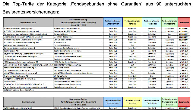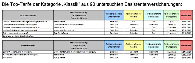 Das Institut für Vorsorge und Finanzplanung (IVFP) hat sich in einem aktuellen Rating 90 Rürup-Versicherungen vorgenommen. Die Einteilung der Tarife erfolgte dabei in die Kategorien „Klassik“, „Klassik Plus“, „Fondsgebunden mit/ohne Garantie“, „Comfort“ und „Indexpolicen“.
