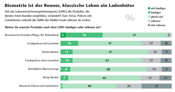 Aber nicht nur die Versicherer, auch die Berater wenden sich mehr und mehr vom Produkt ab. So gibt jeder zweite Makler inzwischen an, dass er Policen mit Garantiezins seltener oder viel seltener anbietet als noch vor einem Jahr. Was ist aber die Alternative, wenn der bisherige Klassiker der Altersvorsorge ausgedient hat? Zum einen werden die Versicherer die Variante Fondspolicen ohne Garantie in den Vordergrund stellen, bei denen die Kapitalanlage aber so gestaltet ist, dass sie risikosenkend wirkt.
