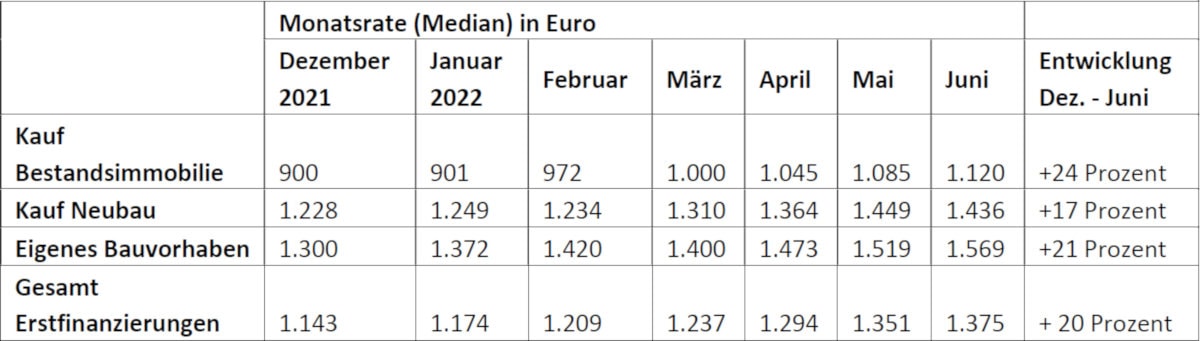 Das schafft nicht mal die Inflation: Käufer und Bauherren müssen heute jeden Monat 20 Prozent mehr auf den Tisch blättern als es noch Ende 2021 gewesen wäre. Die Rate für bestehende Häuser oder Wohnungen ging sogar um 24 Prozent hinauf. Das wertete der Baufinanzierer Dr. Klein aus.