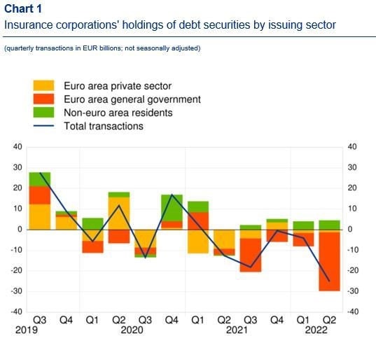 Die folgende Grafik dröselt die Positionen etwas weiter nach Emittentenklassen auf. Dabei zeigt sich, dass die Versicherer den größten Rutsch bei Euro-Staatsanleihen verzeichneten, die nichteuropäischen Positionen hingegen sogar zulegten. Was sicherlich auch daran gelegen hat, dass der US-Dollar gegenüber dem Euro an Wert gewonnen hat. Denn so etwas schlägt sich im Euro-Wert von Dollar-Anleihen nieder.